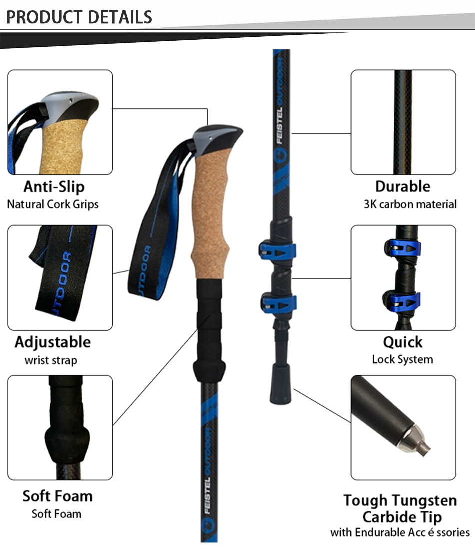 Marque : USINE ANHUI FEISTEL Fabrication liée : OEM et ODM Produit : Bâton de randonnée télescopique léger en aluminium 6013 : verrous à réglage rapide, durable, polyvalent, ergonomique, léger, idéal pour la randonnée, longueur personnalisable, solide.