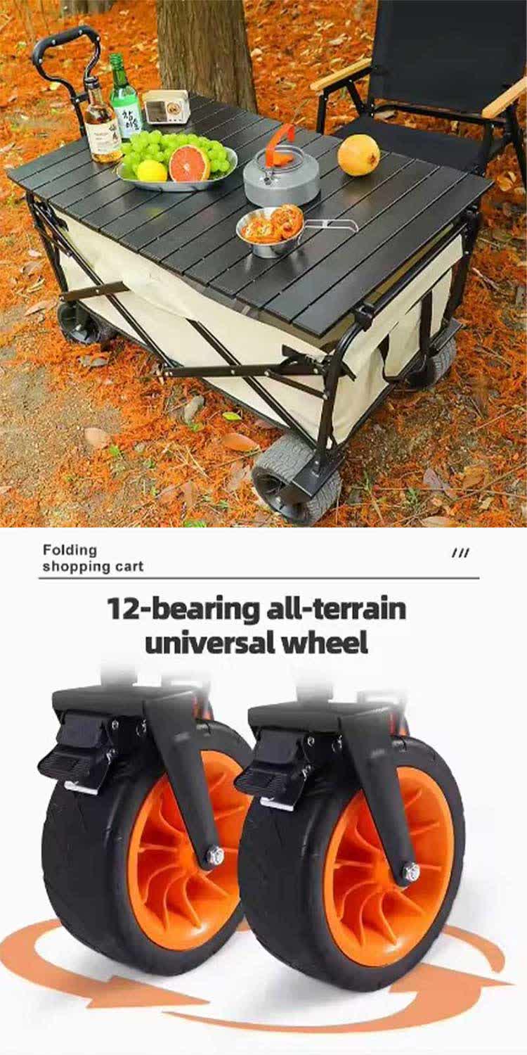 Marque : USINE ANHUI FEITEL Fabrication liée : OEM et ODM Produit : Un chariot robuste et pliable idéal pour le camping et les pique-niques, doté d'une construction durable, de roues tout-terrain et d'une portabilité facile pour les aventures en plein air.
