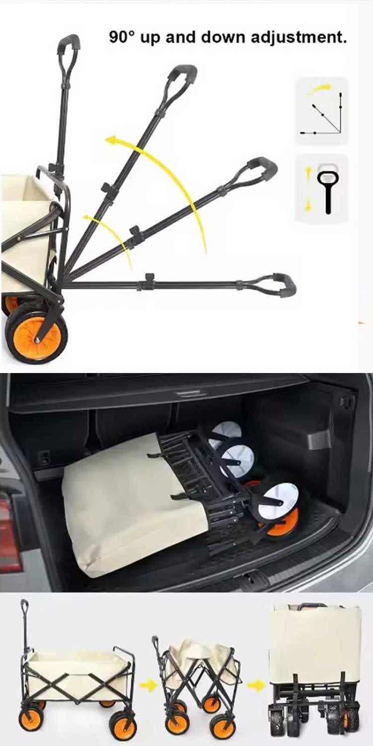 1.conception pliante, économise de l'espace et est facile à transporter ; 2.facile à installer et à ouvrir en une seconde ; 3.grande capacité, plus de stockage ; 4.les deux roues avant peuvent pivoter à 360° et avec des freins doubles ; 5.et adapté à différents terrains, routes, herbe, routes de gravier, boue