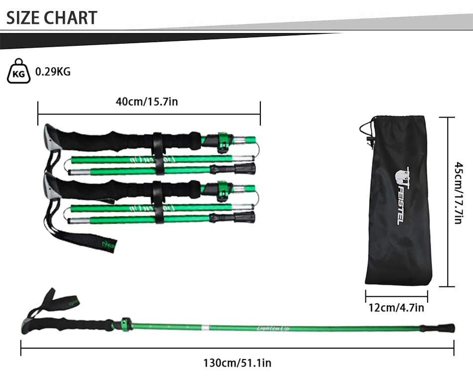 Marque : USINE ANHUI FEISTEL Fabrication liée : OEM et ODM Produit : Ces bâtons de marche pliables multifonctionnels ultralégers en aluminium 7075 sont dotés d'une construction durable, de poignées confortables en EVA et d'une portabilité compacte, offrant un soutien fiable pour la randonnée en plein air, l'escalade, le trekking et les aventures de marche quotidiennes.