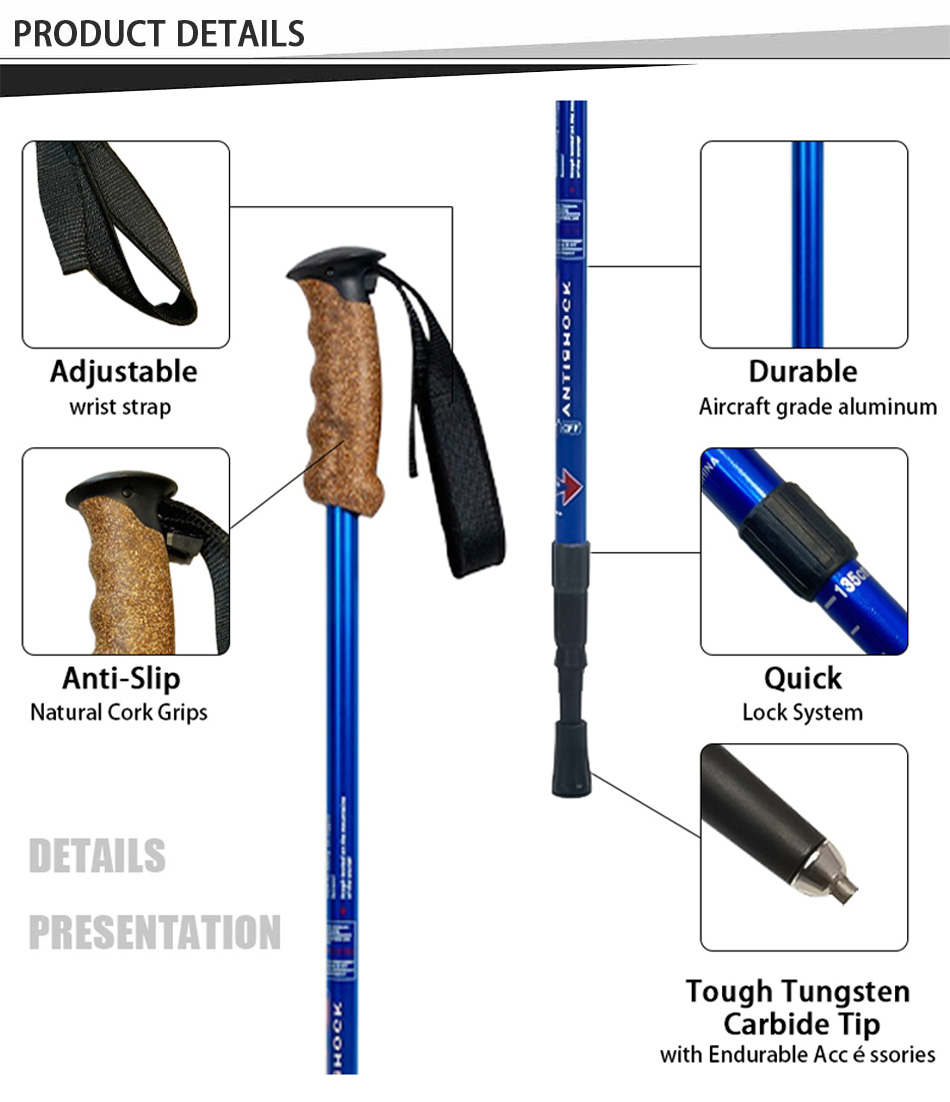 Marque : USINE ANHUI FEISTEL Fabrication liée : OEM et ODM Produit : Bâton de randonnée télescopique léger en aluminium 6013 : verrous à réglage rapide, durable, polyvalent, ergonomique, léger, idéal pour la randonnée, longueur personnalisable, solide.