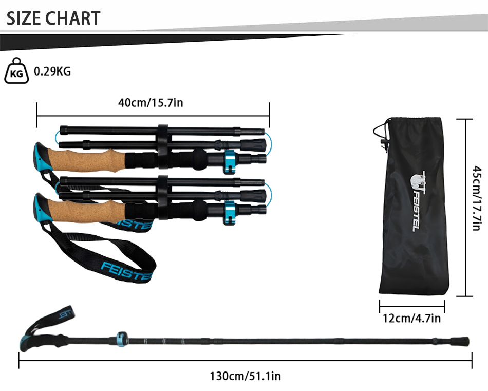 Produit : Les bâtons de randonnée en aluminium sont dotés d'une poignée en liège, d'une hauteur réglable de 110 à 130 cm, d'une conception pliable légère, d'un système de verrouillage rapide et d'embouts antidérapants pour un soutien stable et confortable en randonnée.