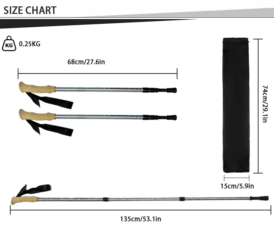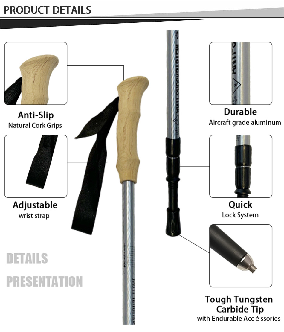 Marque : USINE ANHUI FEISTEL Fabrication liée : OEM et ODM Produit : Bâton de randonnée télescopique léger en aluminium 6013 : verrous à réglage rapide, durable, polyvalent, ergonomique, léger, idéal pour la randonnée, longueur personnalisable, solide.
