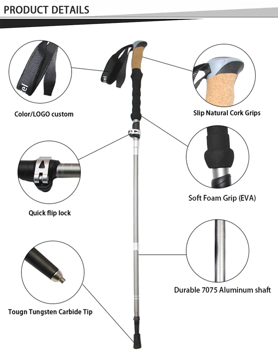 Produit : Ces bâtons de randonnée personnalisés en aluminium aéronautique 7075 à 5 sections sont dotés d'une poignée en liège, d'une conception pliable, d'une sangle de sécurité et d'options OEM pour une performance de marche et de randonnée durable, légère et polyvalente.