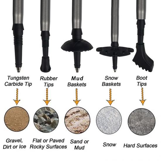 Les bâtons de trekking, en tant que bonne aide pour les sports de plein air, peuvent apporter de nombreux avantages aux activités d'alpinisme en plein air, comme l'amélioration de la stabilité de la marche et la réduction de la charge sur les jambes. Nous avons des bâtons de trekking en fibre de carbone et en alliage d'aluminium ainsi que des bâtons de trekking à trois et quatre sections.