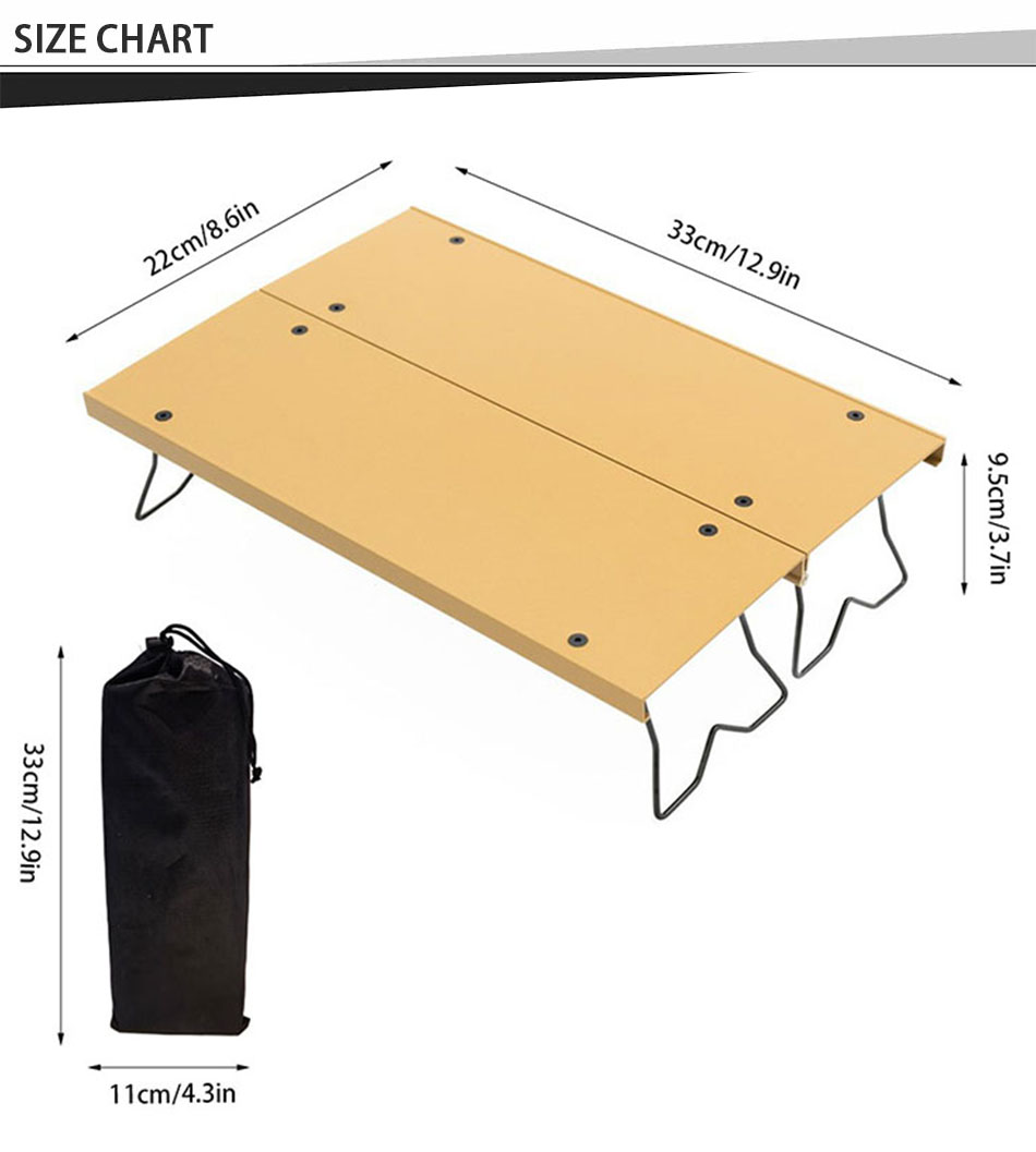 Fabriqué à partir d'alliage d'aluminium de haute qualité, cette table est exceptionnellement légère mais robuste, fournissant un soutien fiable à diverses activités de plein air telles que le camping, les pique-niques, la randonnée, la pêche et les rassemblements d'arrière-cour. Sa conception pliable permet une configuration sans effort et un stockage compact, ce qui facilite le transport et le transport dans un sac à dos ou un coffre de voiture.