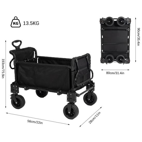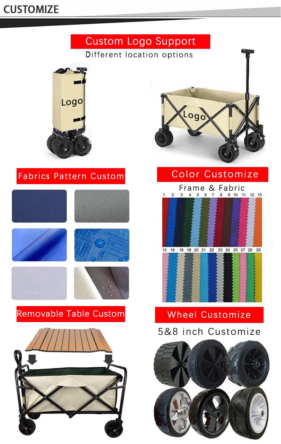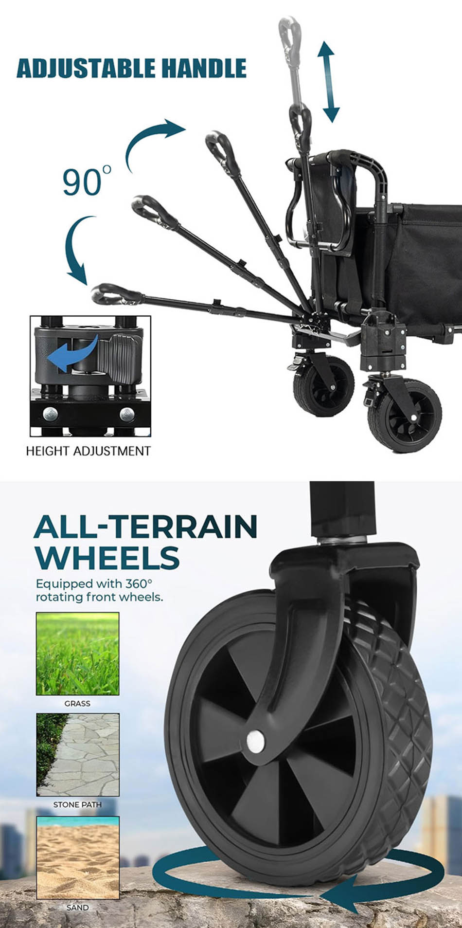 1.conception pliante, économise de l'espace et est facile à transporter ; 2.facile à installer et à ouvrir en une seconde ; 3.grande capacité, plus de stockage ; 4.les deux roues avant peuvent pivoter à 360° et avec des freins doubles ; 5.et adapté à différents terrains, routes, herbe, routes de gravier, boue