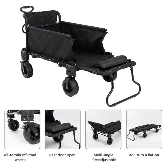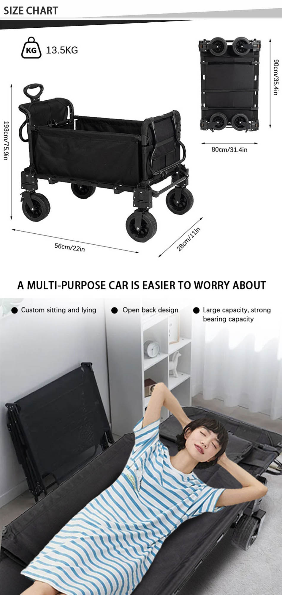 Conçu pour une commodité maximale, il fonctionne comme un chariot de magasinage, un wagon utilitaire pliable et même un canapé-lit, ce qui le rend idéal pour divers besoins.   Le cadre robuste assure la durabilité et la stabilité, tandis que la conception pliable permet un stockage et un transport faciles.