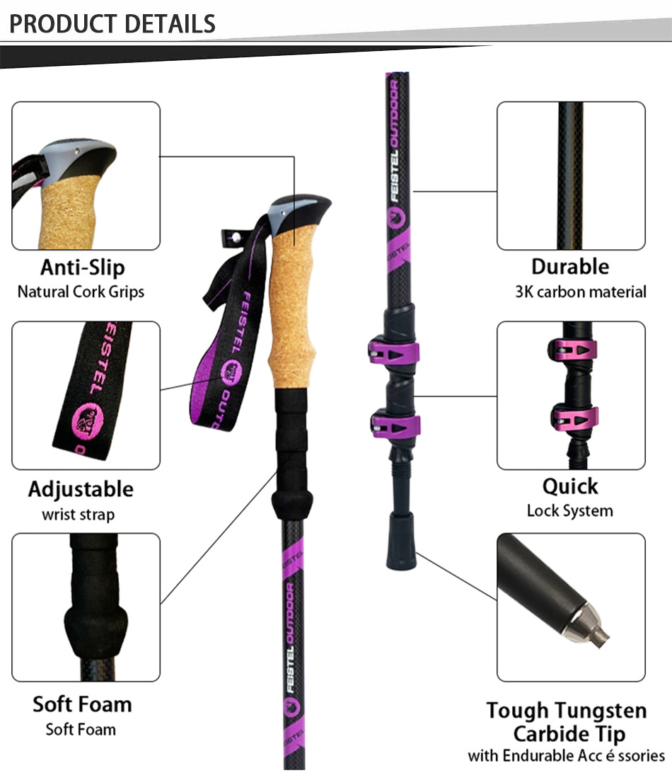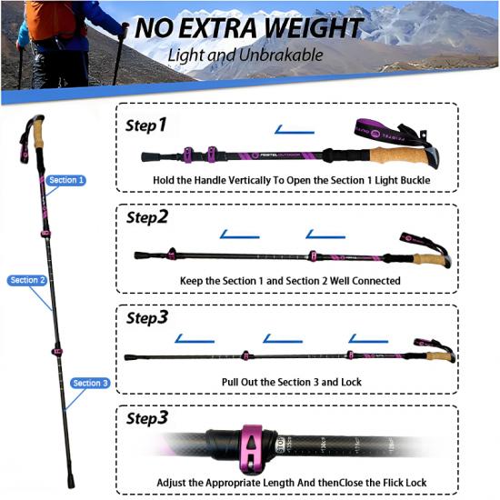 Bâton de randonnée rétractable antichoc à prix d'usine OEM , bâtons de randonnée en fibre de carbone , bâton de randonnée