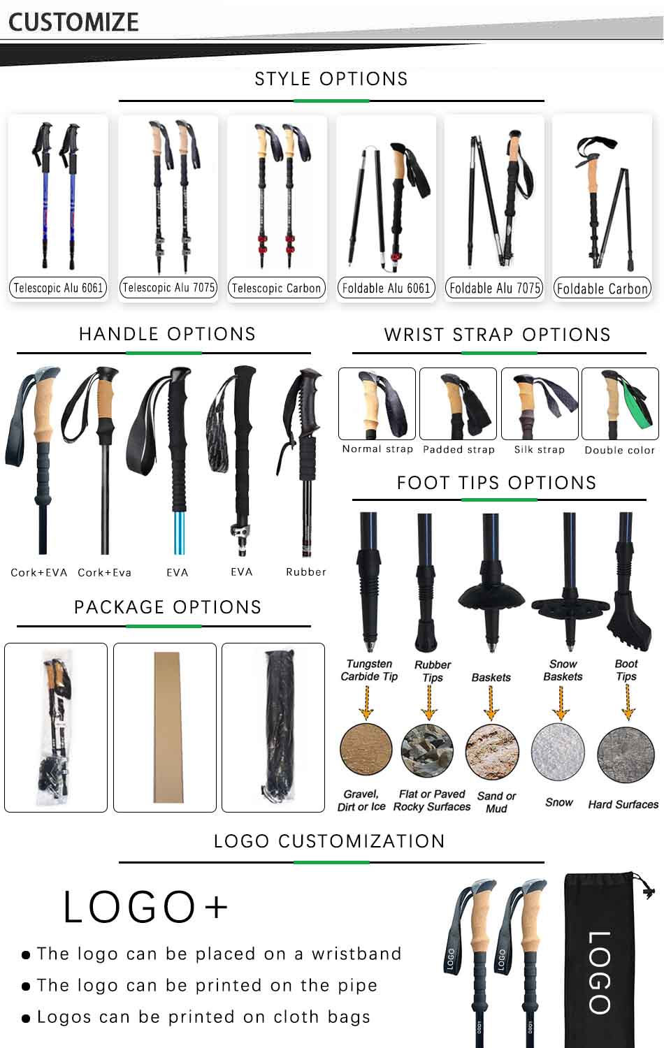 Le matériau du bâton de trekking peut être de l'aluminium 6061, de l'aluminium 7075 ou de la fibre de carbone 100% 3k