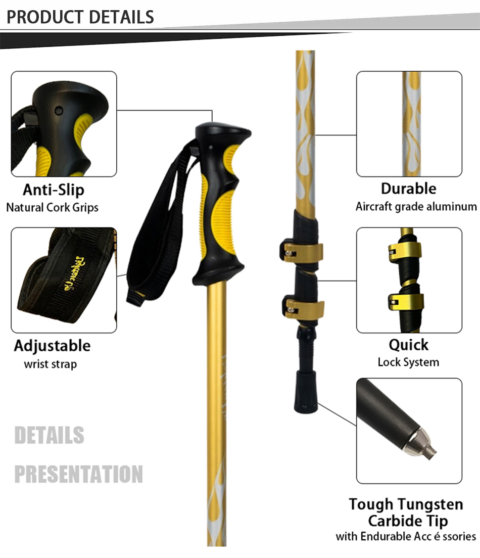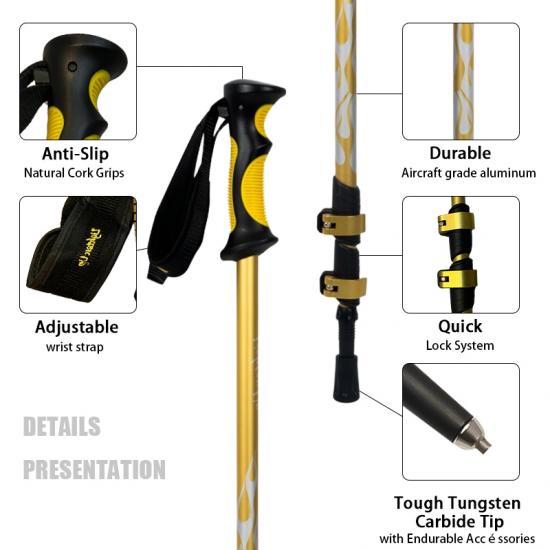 Marque : USINE ANHUI FEISTEL Fabrication liée : OEM et ODM Produit : Bâton de randonnée télescopique léger en aluminium 6013 : verrous à réglage rapide, durable, polyvalent, ergonomique, léger, idéal pour la randonnée, longueur personnalisable, solide.