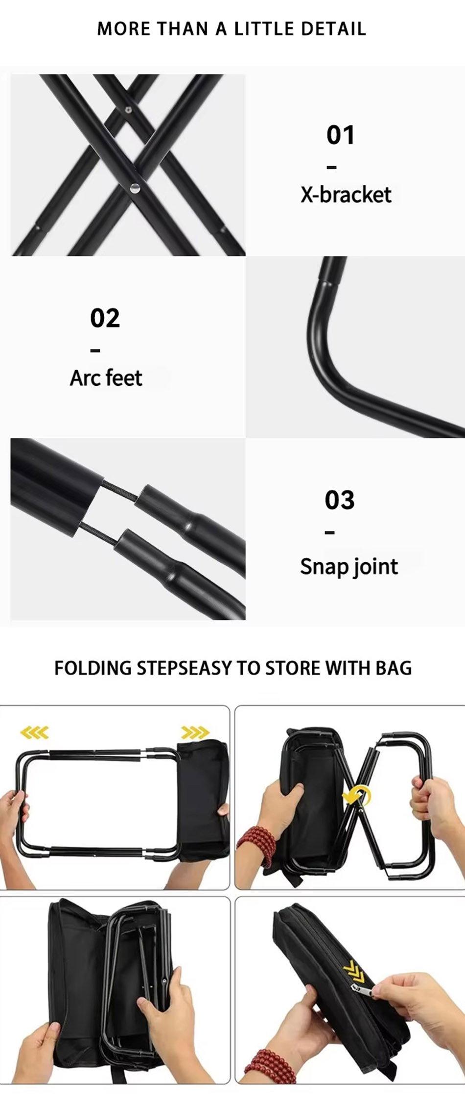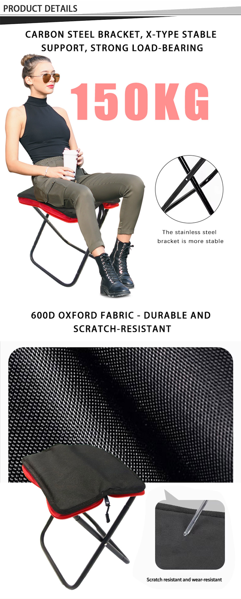 Produit : Ce mini tabouret de randonnée combine un tissu Oxford résistant et pliable avec une poche astucieuse faisant office de trousse, offrant portabilité, confort et praticité pour le camping et les aventures en plein air.