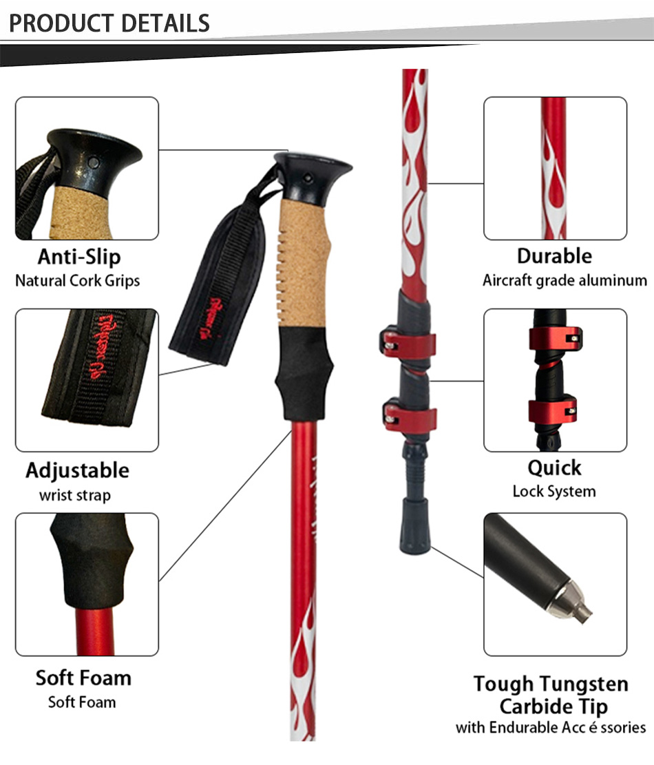 Marque : USINE ANHUI FEISTEL Fabrication liée : OEM et ODM Produit : Bâton de randonnée télescopique léger en aluminium 6013 : verrous à réglage rapide, durable, polyvalent, ergonomique, léger, idéal pour la randonnée, longueur personnalisable, solide.