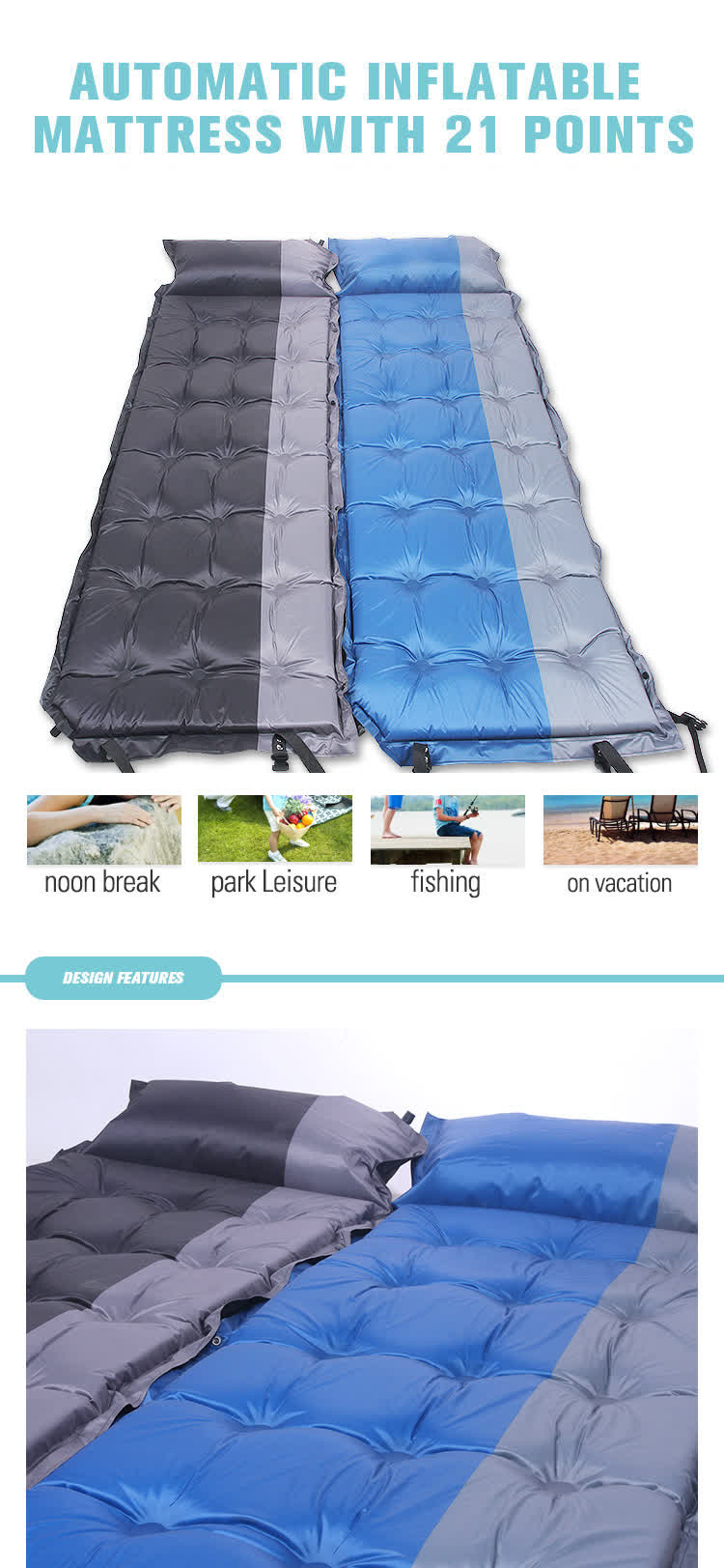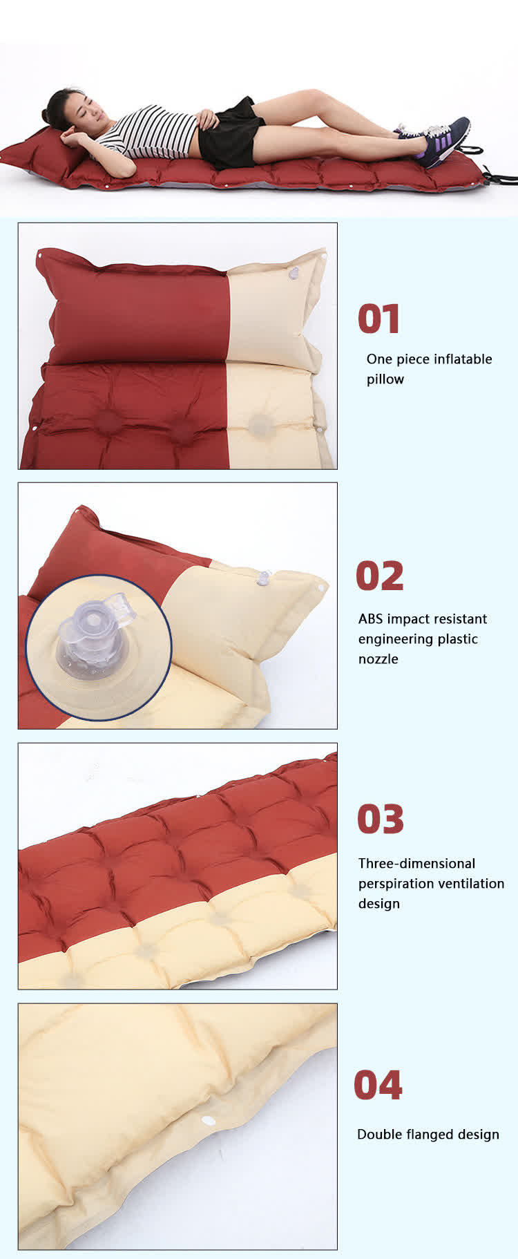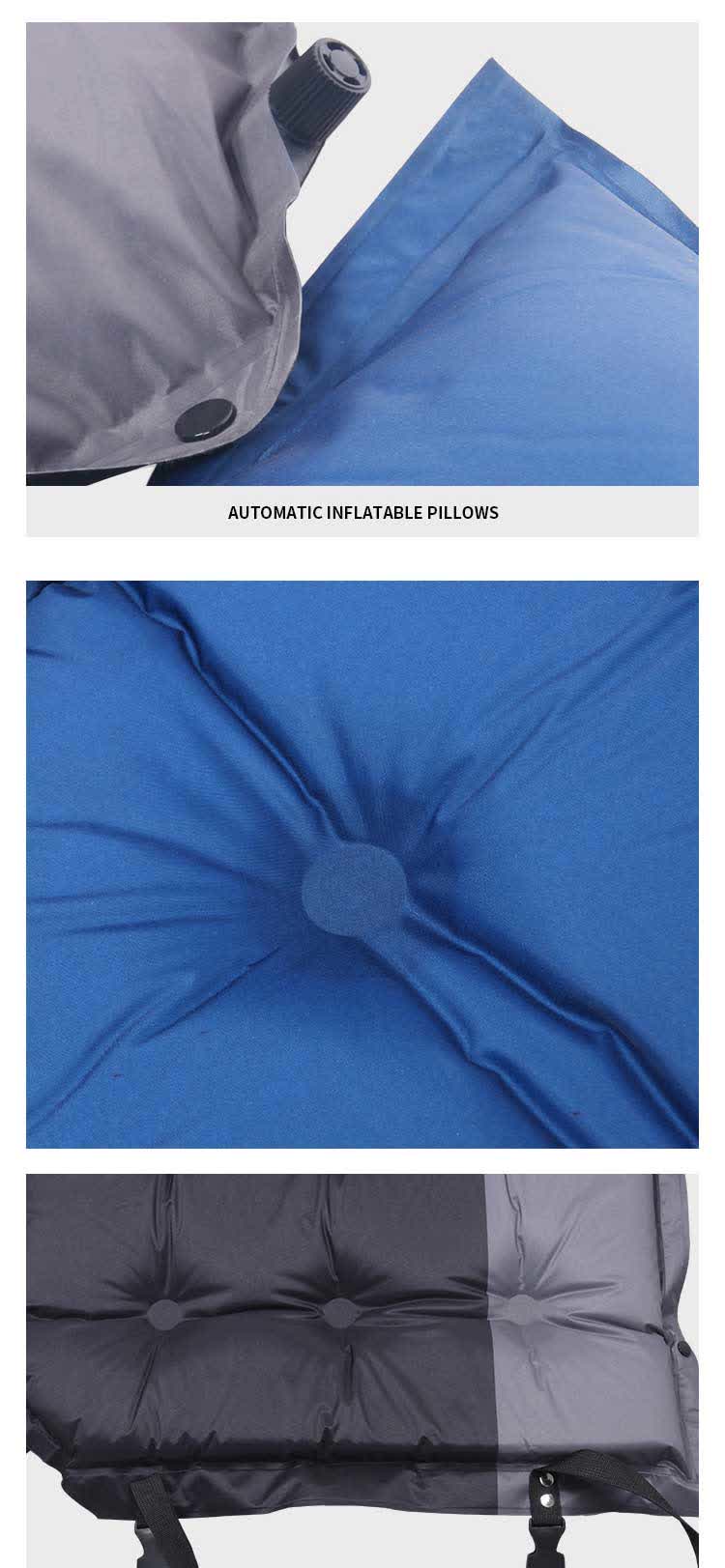 Lors de son utilisation, ouvrez simplement le trou d'aération et le  matelas de couchage auto-gonflant unique  peut se gonfler automatiquement, ce qui le rend pratique et rapide. Dans le même temps, l'épaisseur et la largeur du coussin peuvent également fournir un soutien et un confort de sommeil suffisants. Il existe ici deux styles : un coussin gonflable de 3 cm d'épaisseur et un coussin gonflable de 5 cm d'épaisseur. En camping, apporter un coussin gonflable automatique de camping en plein air peut non seulement vous aider à mieux dormir, mais également aider à soulager l'inconfort physique causé par la fatigue de la route.