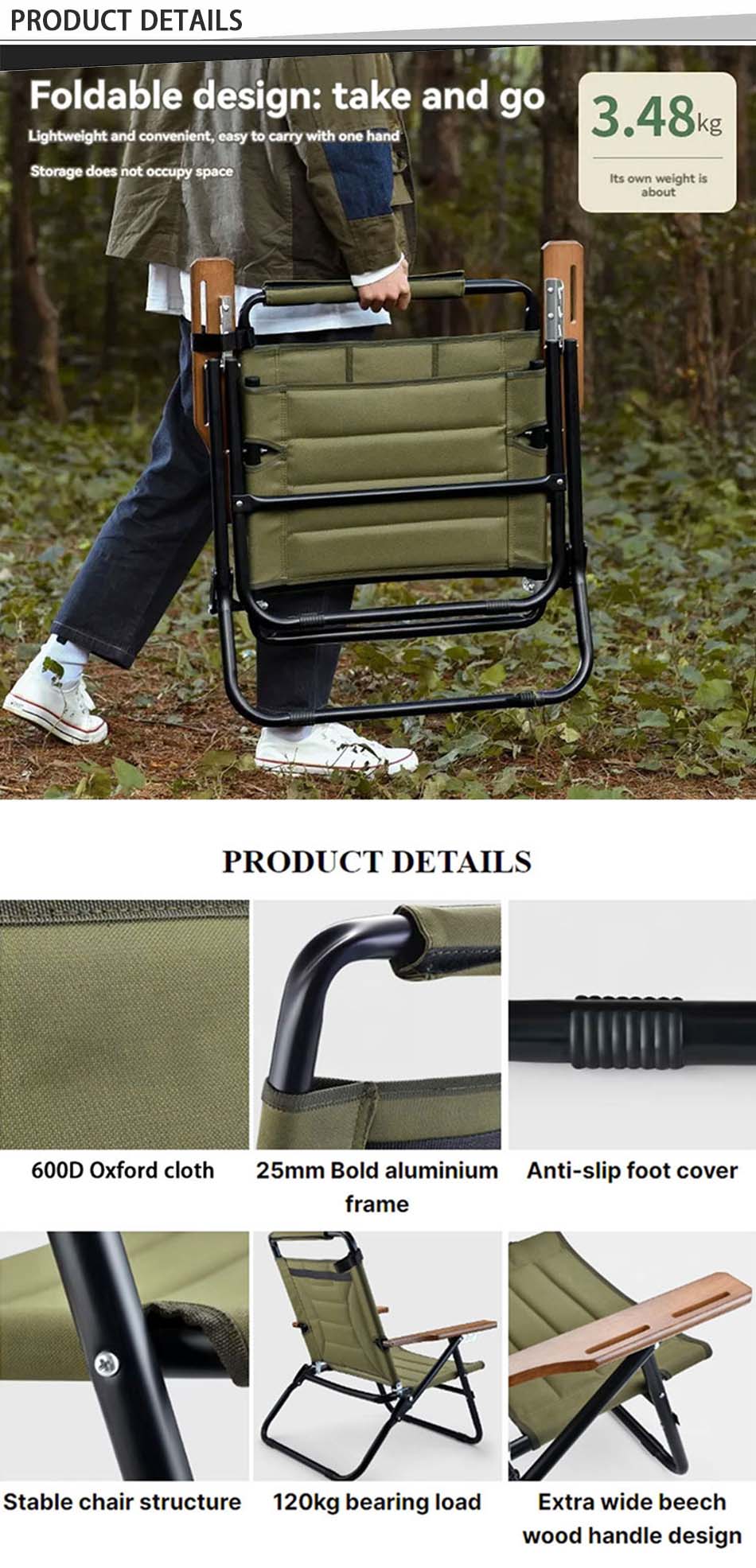 Marque : USINE ANHUI FEISTEL Fabrication de relations : OEM et ODM Produit : Cette chaise longue de camping pliable en bois est dotée d'un cadre robuste, d'une conception inclinable ergonomique et d'une structure pliante compacte, parfaite pour se détendre à la plage, au camping ou dans l'arrière-cour.