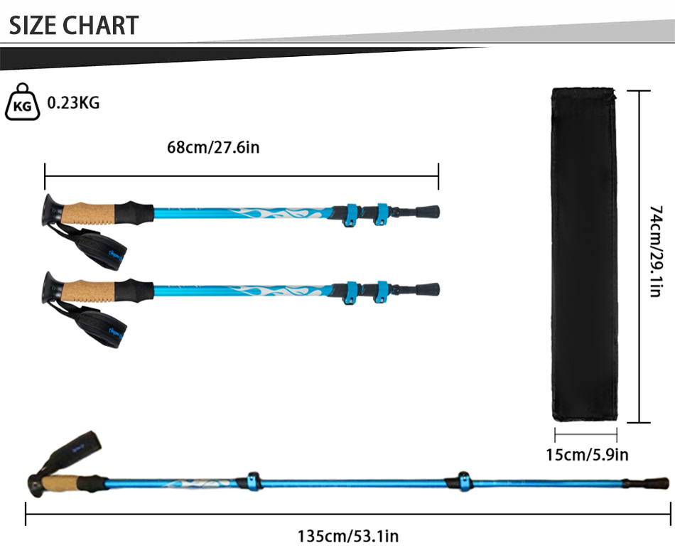 Marque : USINE ANHUI FEISTEL Fabrication liée : OEM et ODM Produit : Bâton de randonnée télescopique léger en aluminium 6013 : verrous à réglage rapide, durable, polyvalent, ergonomique, léger, idéal pour la randonnée, longueur personnalisable, solide.