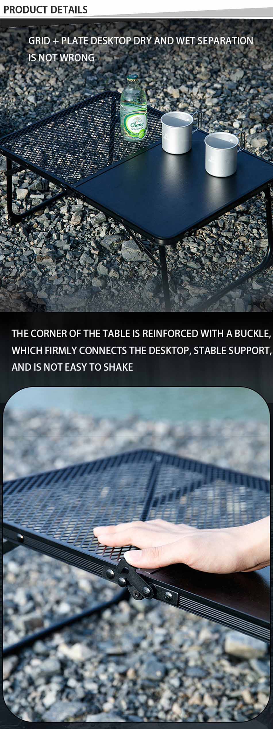 1. Conception de table de camping pliante : la conception pliante de la table est pratique à transporter et permet d'économiser de l'espace. 2. Facile à assembler, aucun autre outil n'est nécessaire et la table peut être assemblée en quelques secondes seulement, économisant du temps et des efforts. 3. Super durable et stable : fabriqué en alliage d'aluminium de haute qualité, robuste et durable, imperméable et facile à nettoyer. 4. Service personnalisé : vous avez le choix entre différentes tailles et couleurs, et vous pouvez également personnaliser le logo. 5. Polyvalent: particulièrement adapté aux activités de plein air, utilisé comme table de camping en plein air, randonnée, pique-nique, barbecue, table de pique-nique, pêche, plage et utilisation intérieure.