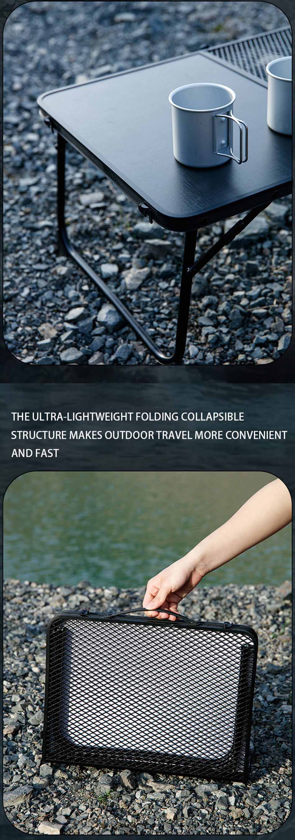 Produit : La table de camping en maille portable ultralégère pour meubles de jardin d'extérieur est dotée d'un cadre en aluminium durable, d'une conception pliable IGT compacte et d'une surface en maille respirante idéale pour une utilisation polyvalente en extérieur.