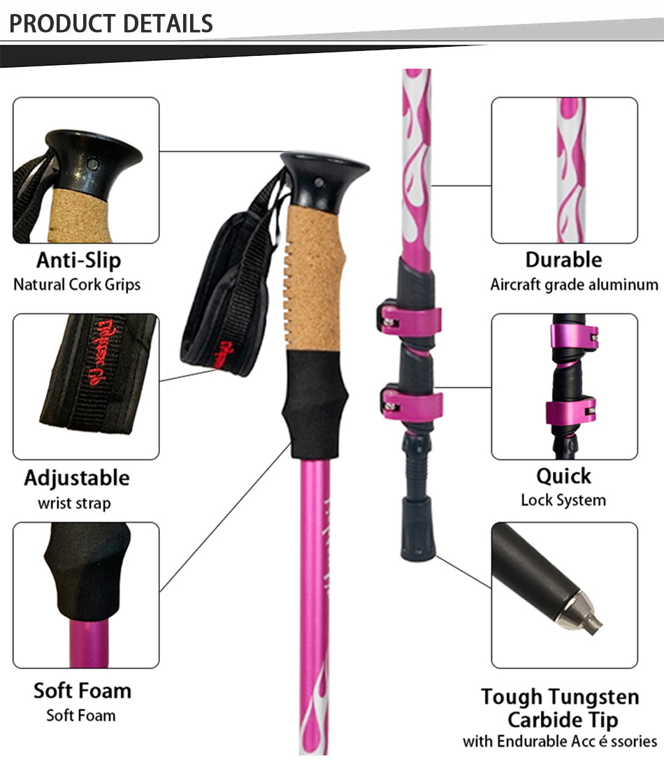 Marque : USINE ANHUI FEISTEL Fabrication liée : OEM et ODM Produit : Bâton de randonnée télescopique léger en aluminium 6013 : verrous à réglage rapide, durable, polyvalent, ergonomique, léger, idéal pour la randonnée, longueur personnalisable, solide.