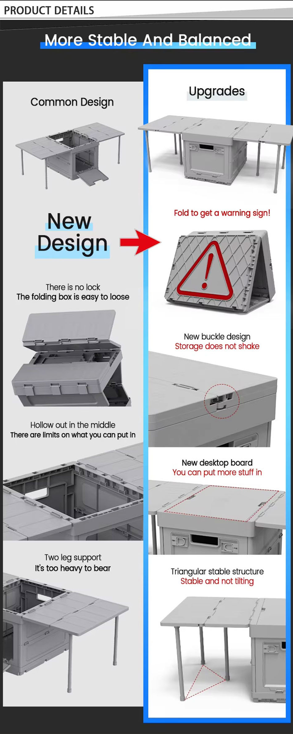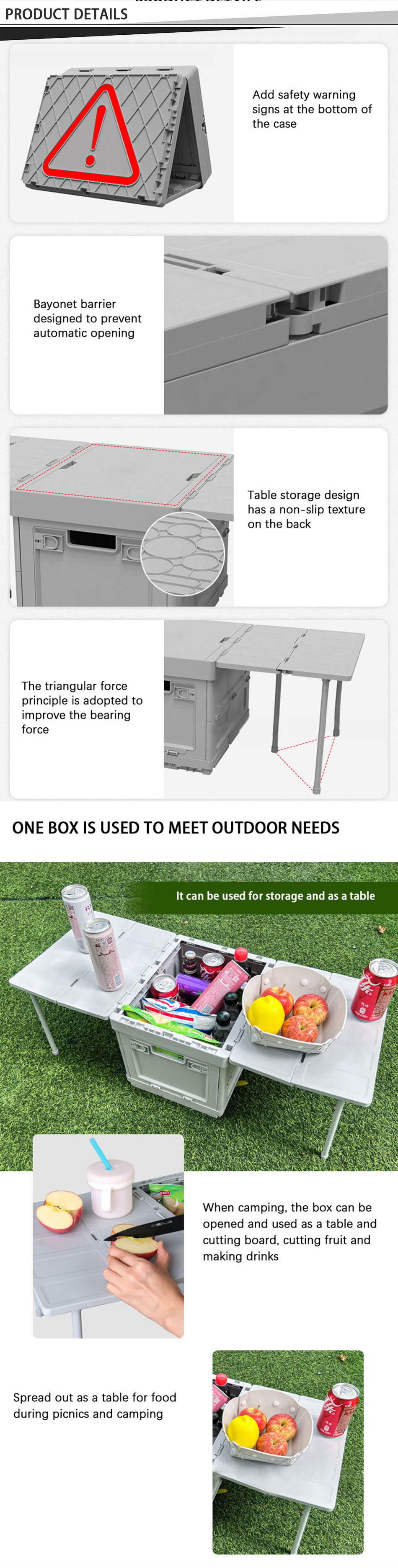 Produit : Cette boîte de stockage en plastique à ouverture latérale multifonctionnelle extérieure dispose d'une conception pliable à l'épreuve de l'humidité, offrant un stockage durable et pratique pour le camping, les voyages et diverses activités de plein air.