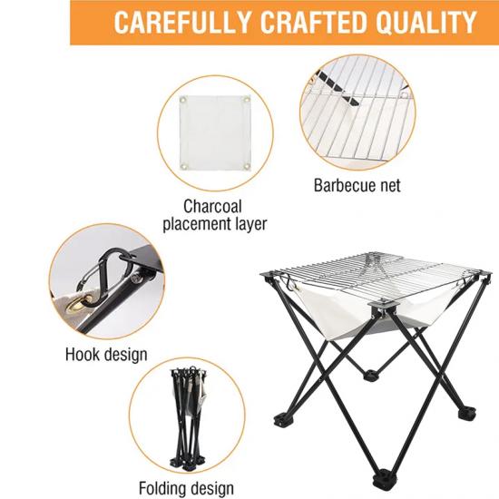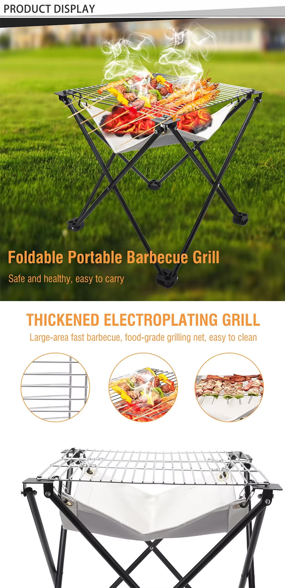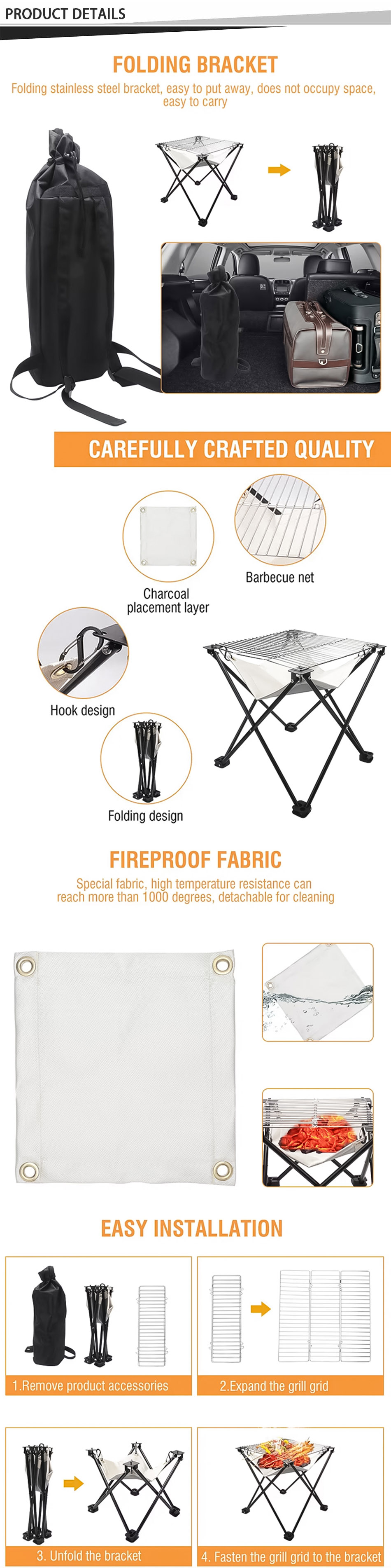 Produit : Ce gril pliant portable extérieur dispose d'un tissu ignifuge, d'un cadre en acier inoxydable et d'une conception compacte, ce qui le rend durable, léger, résistant à la chaleur et parfait pour les pique-niques de barbecue.