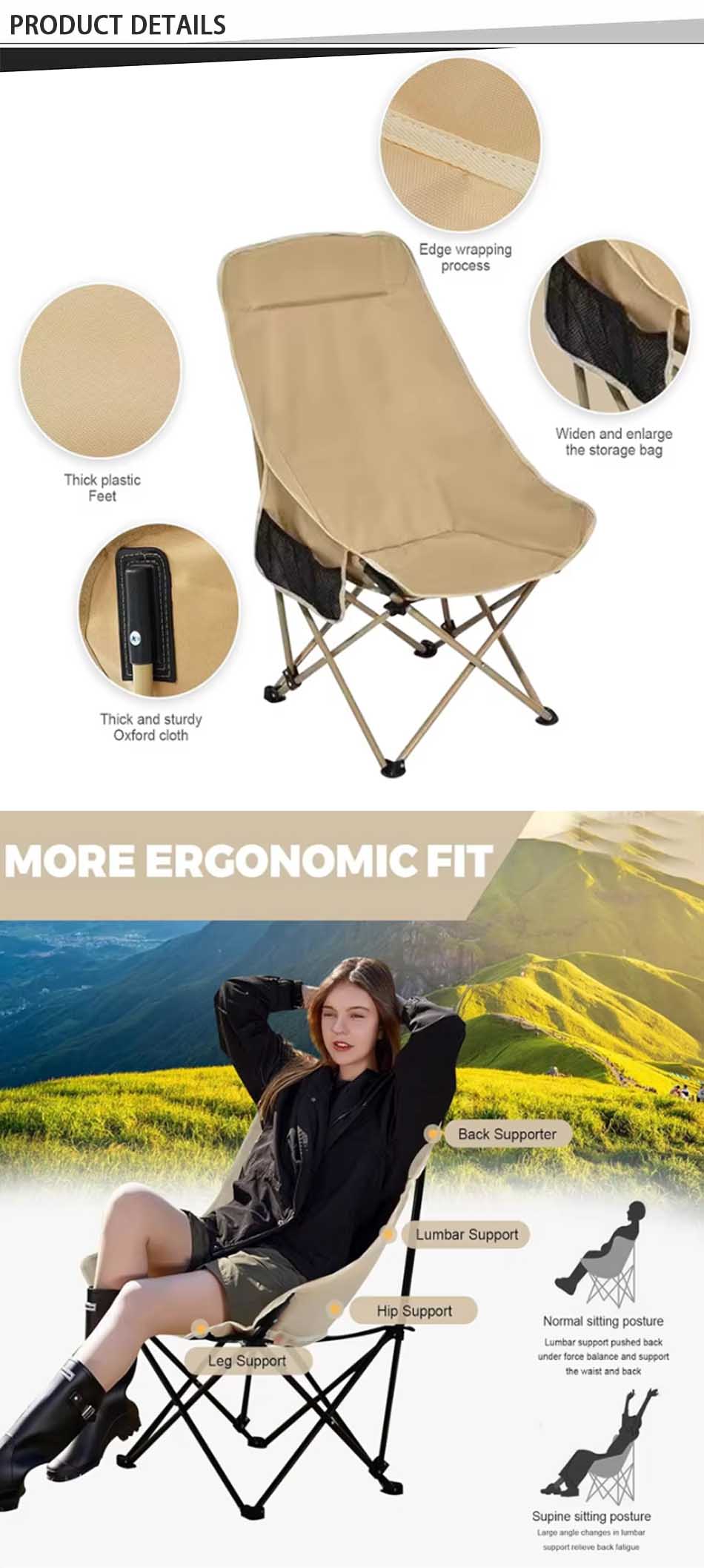 Marque : USINE ANHUI FEISTEL Fabrication de relations : OEM et ODM Produit : La chaise de lune pliable en fer métallique léger et personnalisé offre un soutien et un confort durables, idéale pour le camping en plein air, avec une conception compacte et portable pour un transport et un stockage faciles.