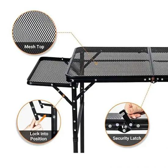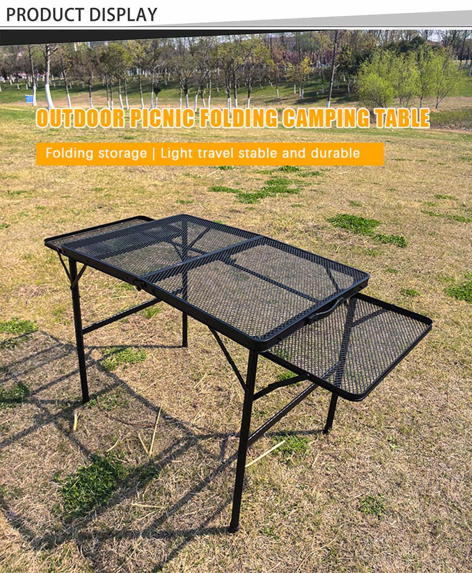 Produit : Cette table de grill en métal pliant en extérieur de pique-nique comprend deux étagères latérales, offrant une stabilité, une durabilité et une commodité pour le camping familial, la cuisine en plein air et les rassemblements de barbecue.