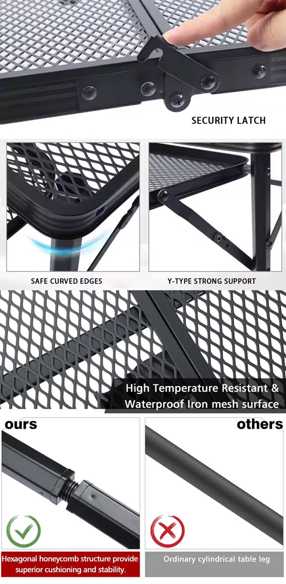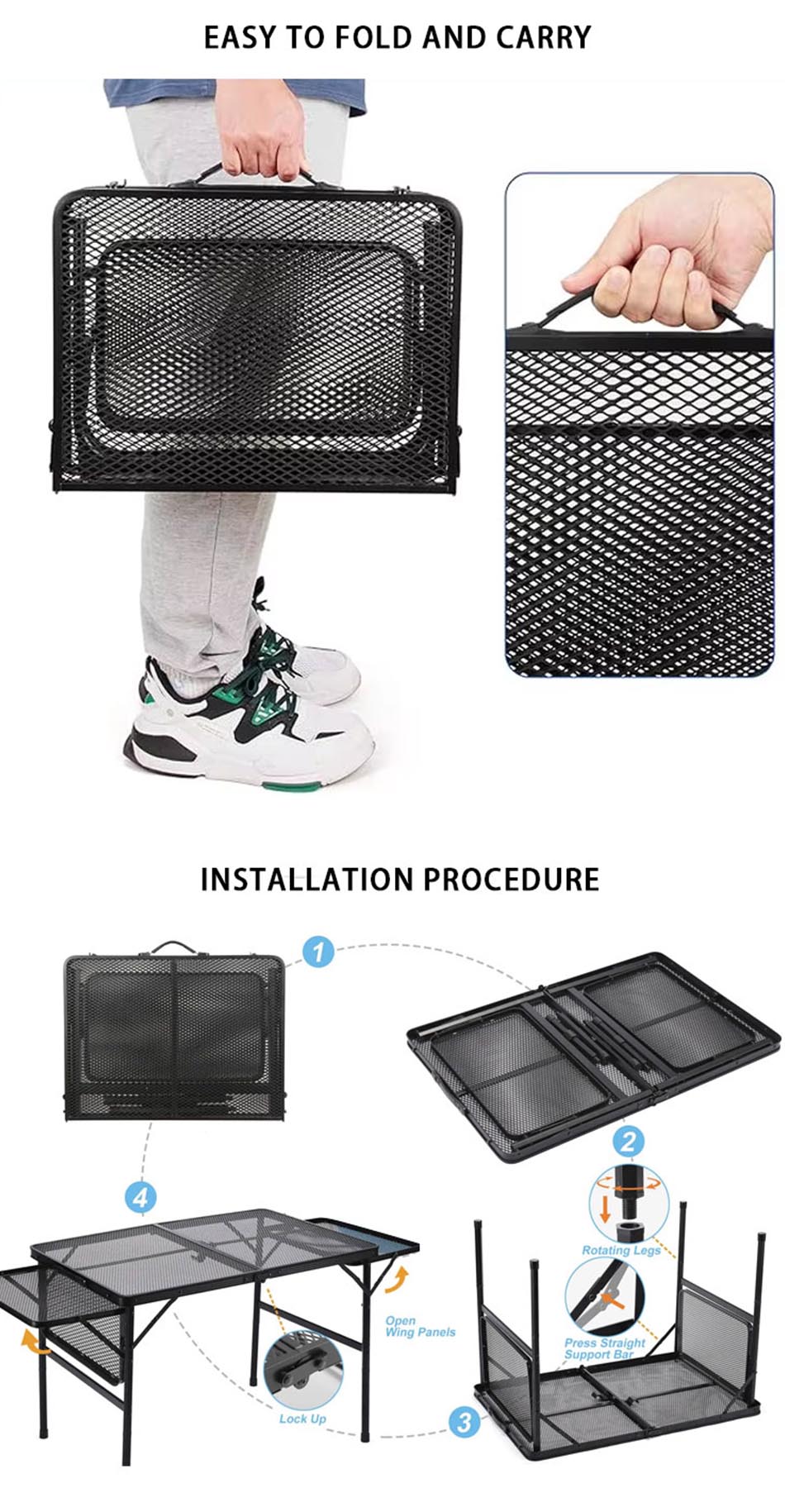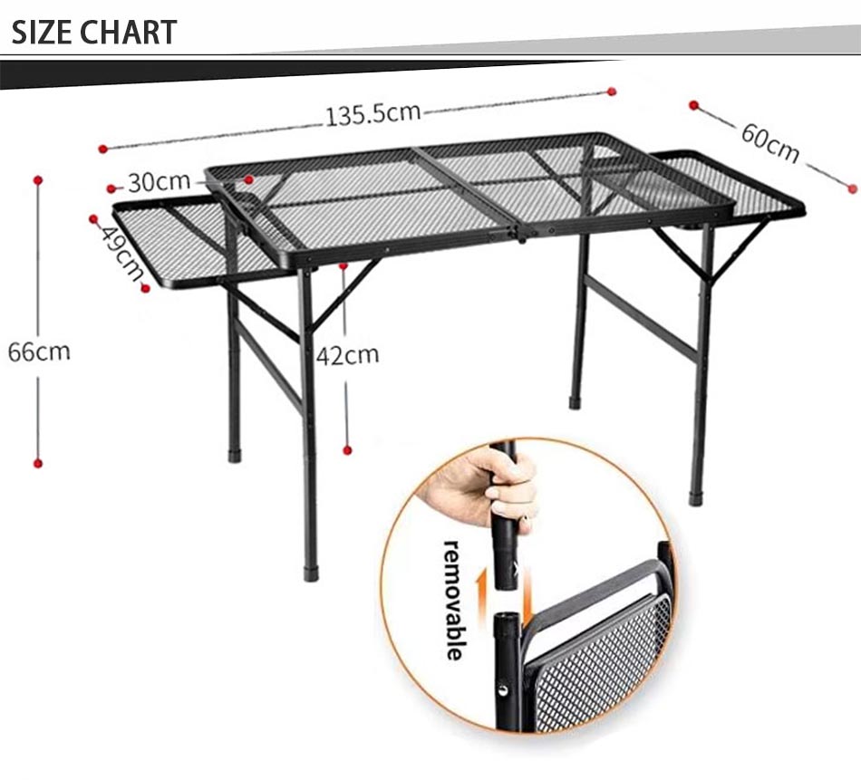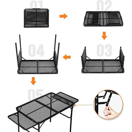 Construit en métal de haute qualité, il offre une excellente stabilité et une capacité de poids, garantissant une surface fiable pour les grillades et la préparation des repas. La conception pliable permet une configuration facile, un stockage compact et une portabilité pratique.