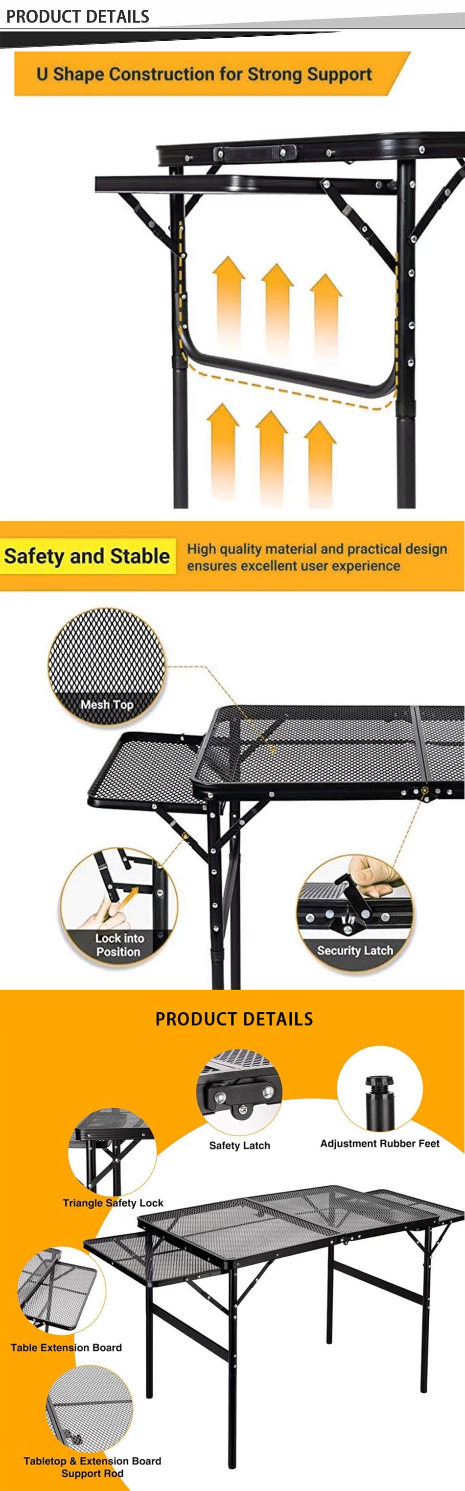 1. Conception de table de camping pliante : la conception pliante de la table est pratique à transporter et permet d'économiser de l'espace. 2. Facile à assembler, aucun autre outil n'est nécessaire et la table peut être assemblée en quelques secondes seulement, économisant du temps et des efforts. 3. Super durable et stable : fabriqué en alliage d'aluminium de haute qualité, robuste et durable, imperméable et facile à nettoyer. 4. Service personnalisé : vous avez le choix entre différentes tailles et couleurs, et vous pouvez également personnaliser le logo. 5. Polyvalent: particulièrement adapté aux activités de plein air, utilisé comme table de camping en plein air, randonnée, pique-nique, barbecue, table de pique-nique, pêche, plage et utilisation intérieure.