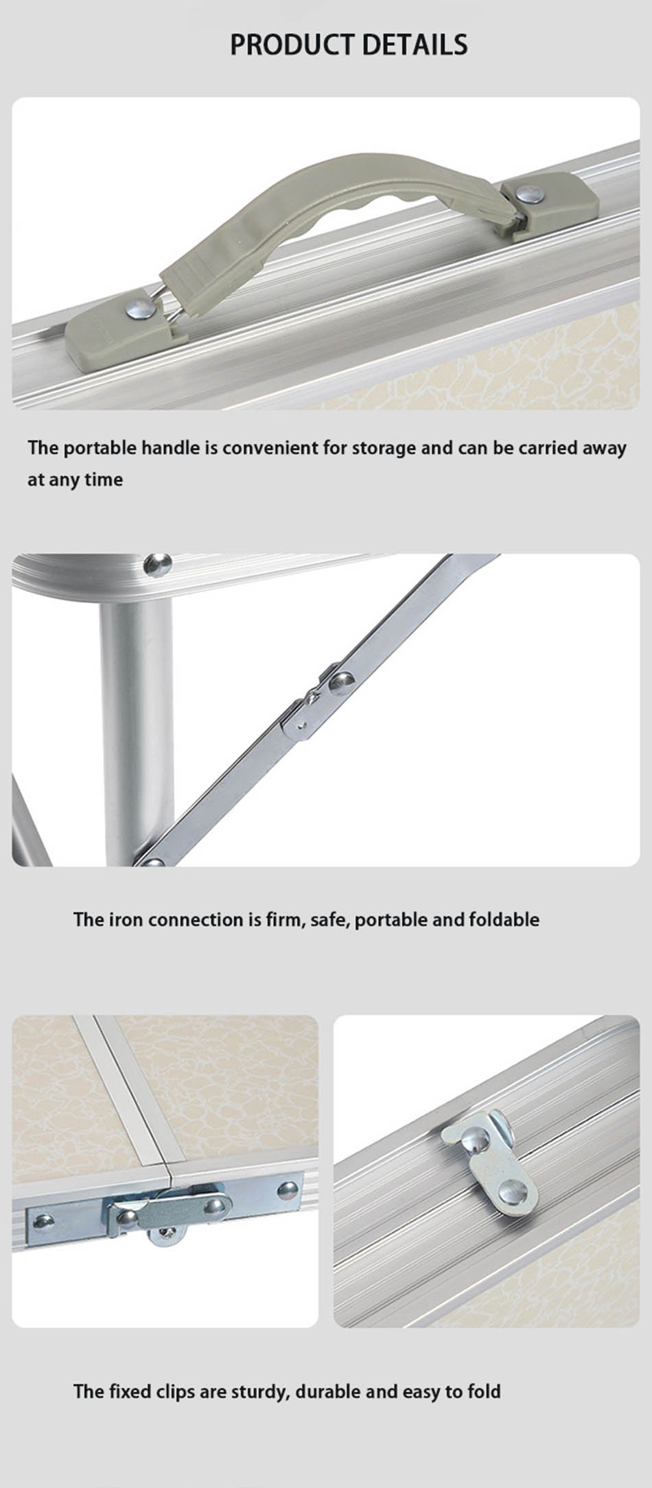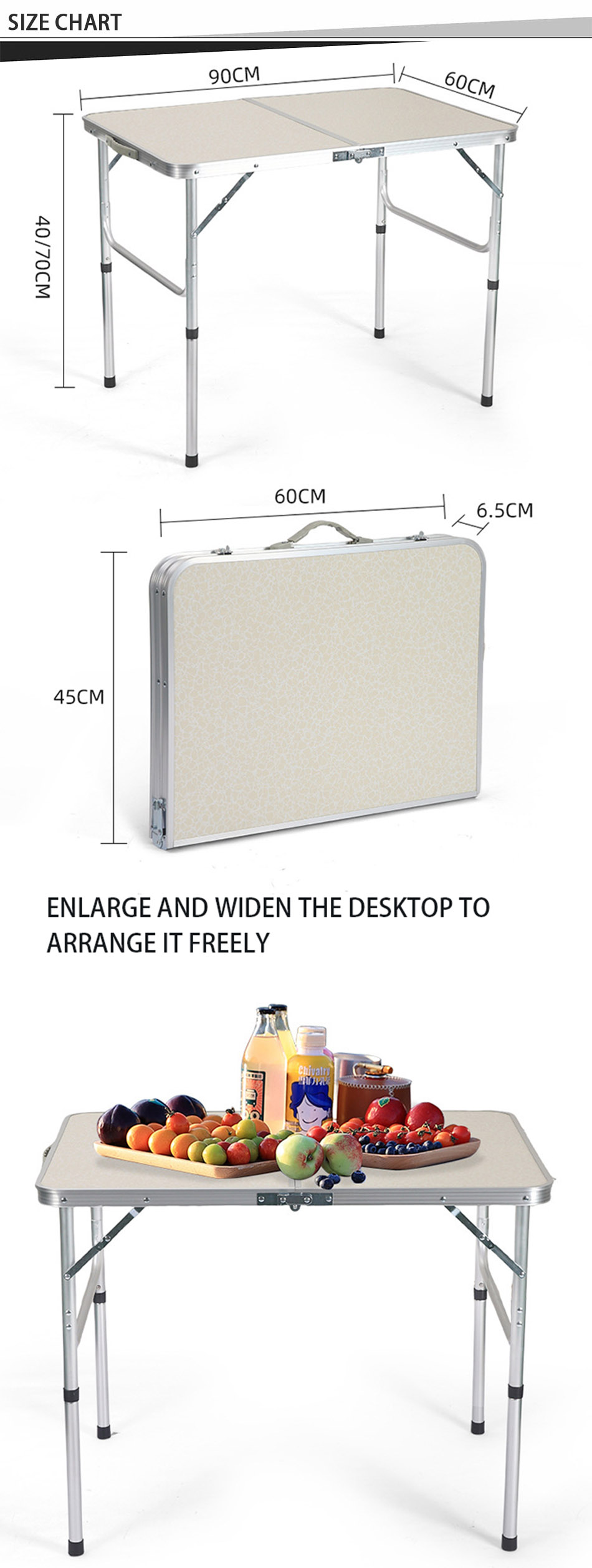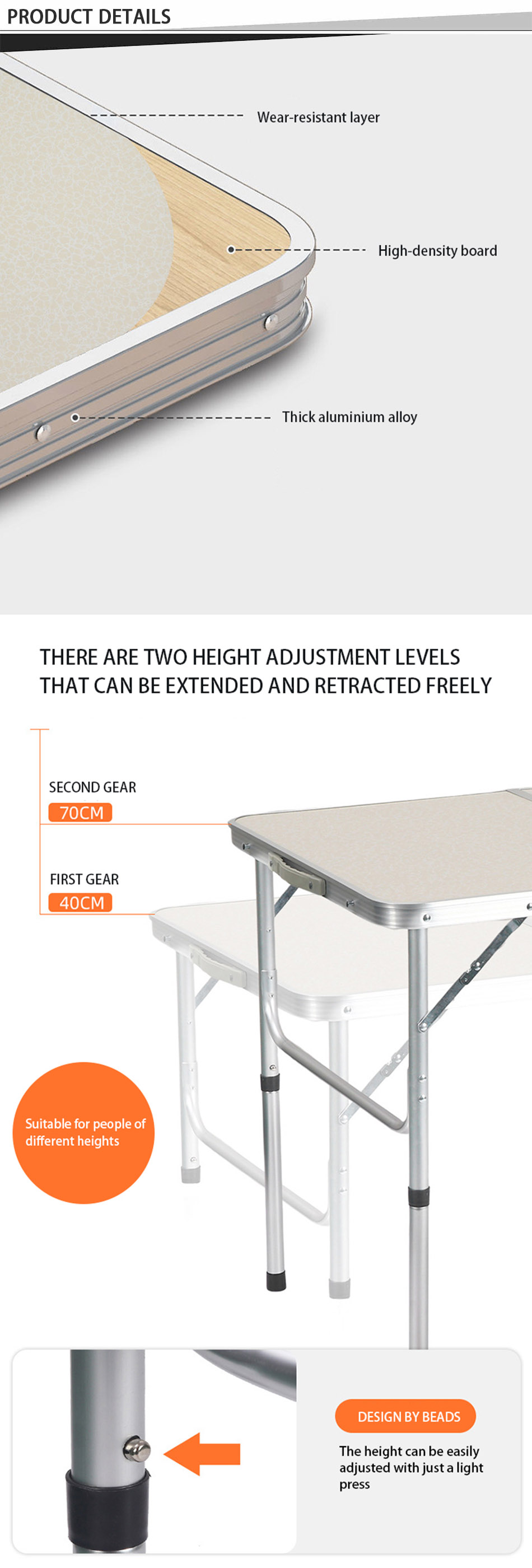 1. Conception de table de camping pliante : la conception pliante de la table est pratique à transporter et permet d'économiser de l'espace. 2. Facile à assembler, aucun autre outil n'est nécessaire et la table peut être assemblée en quelques secondes seulement, économisant du temps et des efforts. 3. Super durable et stable : fabriqué en alliage d'aluminium de haute qualité, robuste et durable, imperméable et facile à nettoyer. 4. Service personnalisé : vous avez le choix entre différentes tailles et couleurs, et vous pouvez également personnaliser le logo. 5. Polyvalent: particulièrement adapté aux activités de plein air, utilisé comme table de camping en plein air, randonnée, pique-nique, barbecue, table de pique-nique, pêche, plage et utilisation intérieure.
