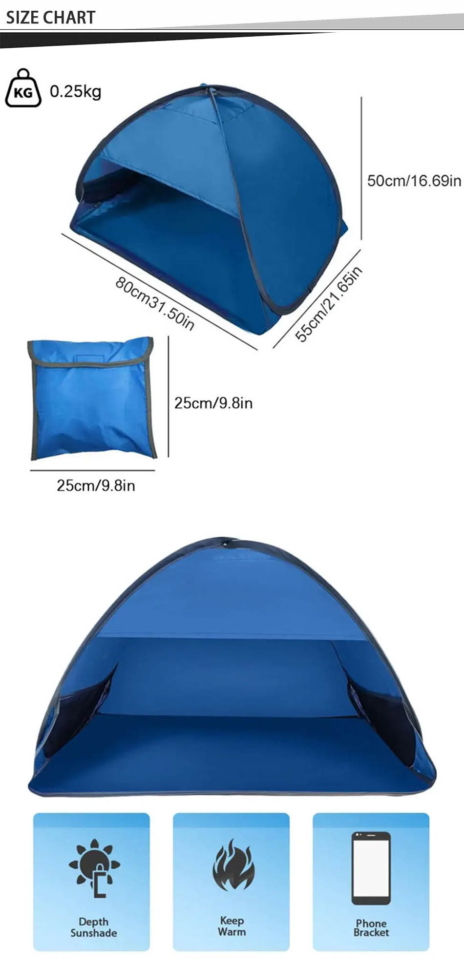 cette tente de plage pop-up mesure 65 x 59 x 43 pouces (L x l x H) et pèse 2 livres