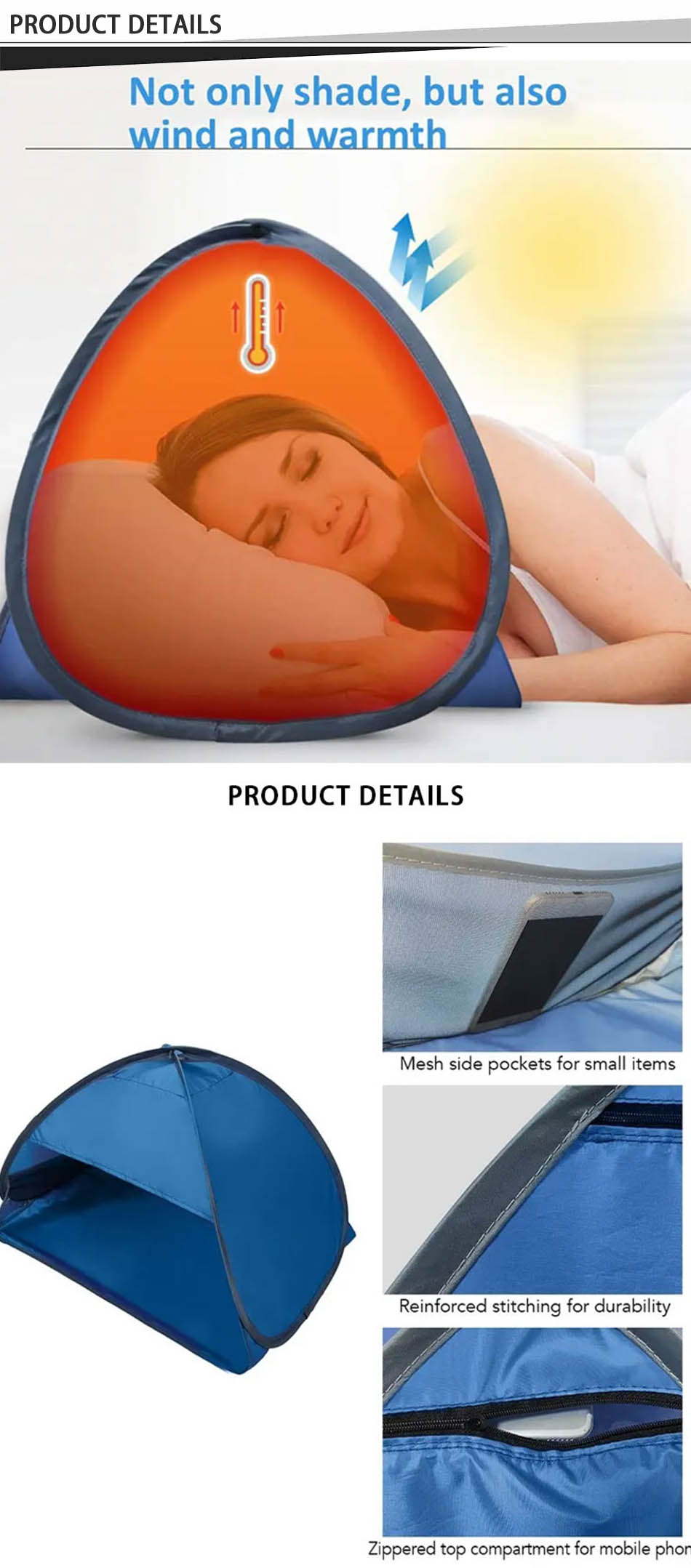 Produit : Cette mini tente de tête portable pour l'extérieur offre une protection imperméable et respirante pour les siestes à la plage, l'abri solaire ou le camping, assurant confort et ombre à tout moment et en tout lieu.
