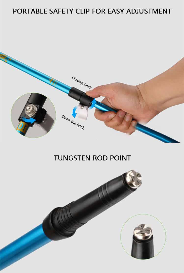 Marque : USINE ANHUI FEISTEL Fabrication liée : OEM et ODM Produit : Bâton de randonnée télescopique léger en aluminium 6013 : verrous à réglage rapide, durable, polyvalent, ergonomique, léger, idéal pour la randonnée, longueur personnalisable, solide.