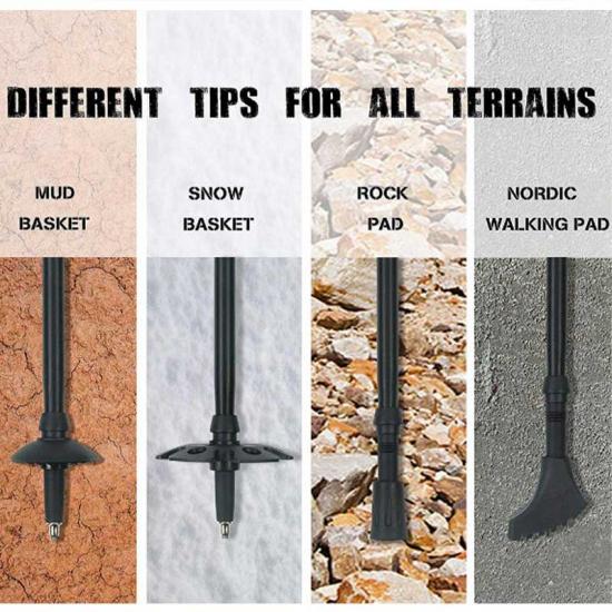 ce bâton de randonnée est également livré avec un protecteur de pointe en caoutchouc facile à ranger, un connecteur de bâton et un panier à boue.