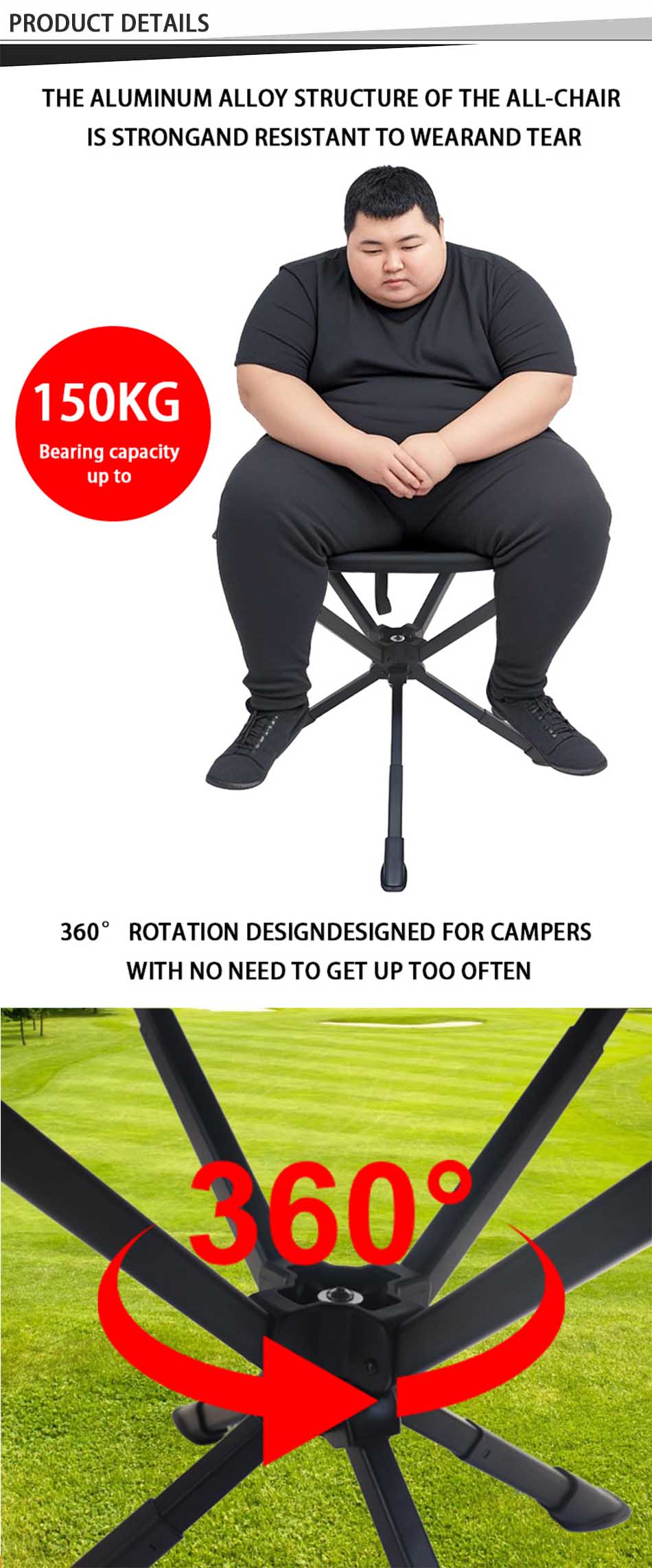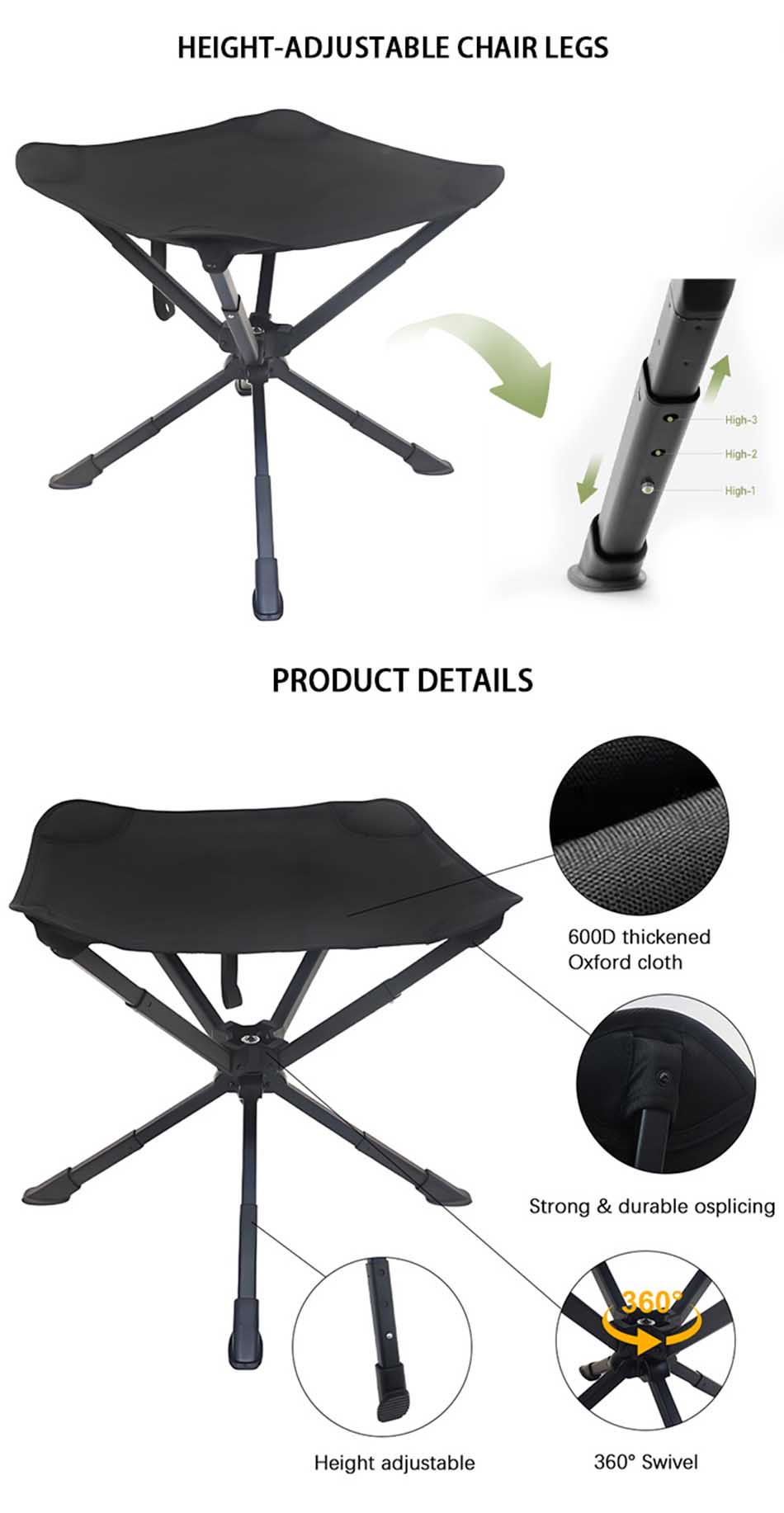Produit : Le tabouret pliant ultraléger en alliage d'aluminium est une option d'assise compacte et portable idéale pour le camping, les barbecues, la pêche et l'utilisation en extérieur, offrant durabilité et transport facile.