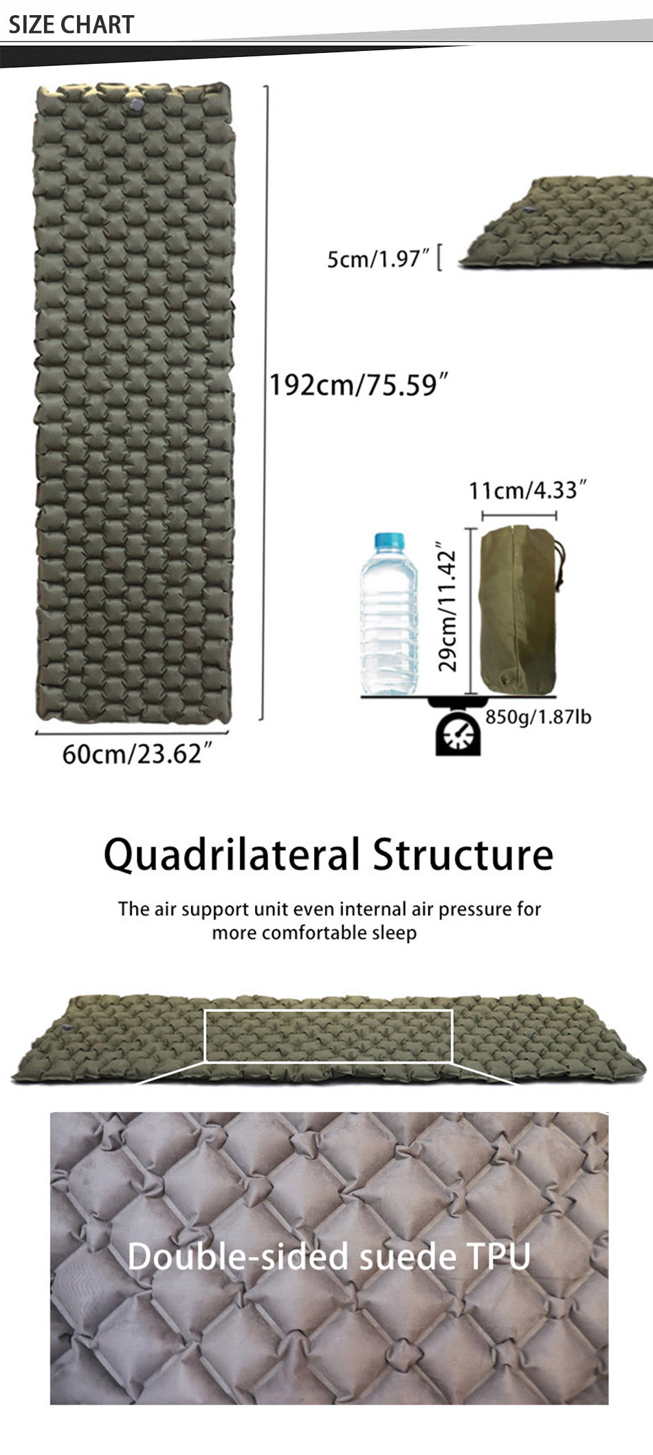 Featuring a premium TPU construction with a soft suede surface on both sides, it provides excellent cushioning and insulation for a restful sleep. :