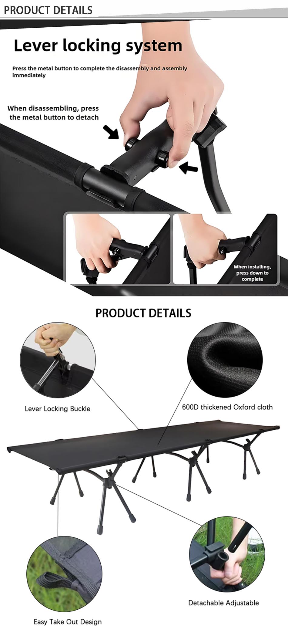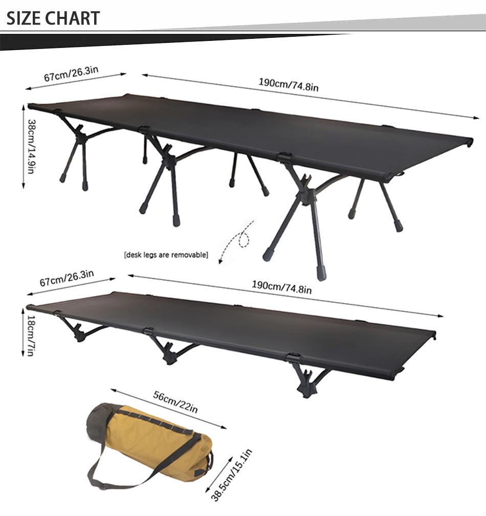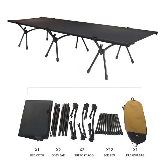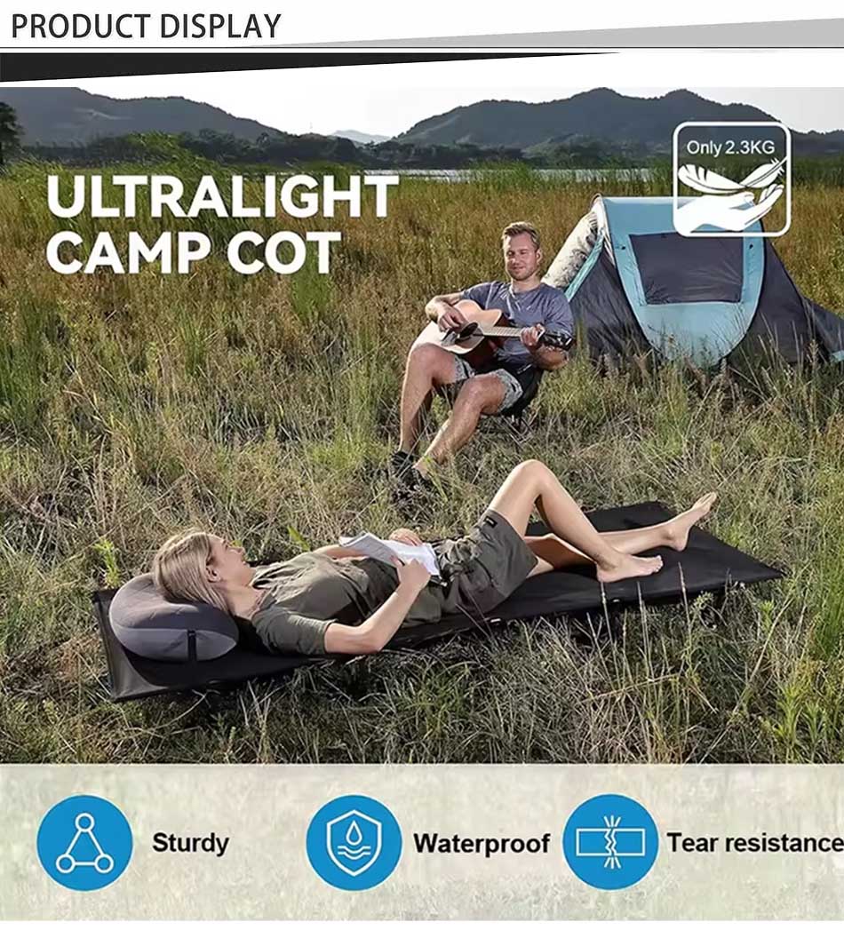 Produit : Le lit de couchage de voyage pour équipement de randonnée en gros est un lit de camping pliable à hauteur réglable offrant un support robuste, une portabilité facile et un repos confortable pour les aventures en plein air.