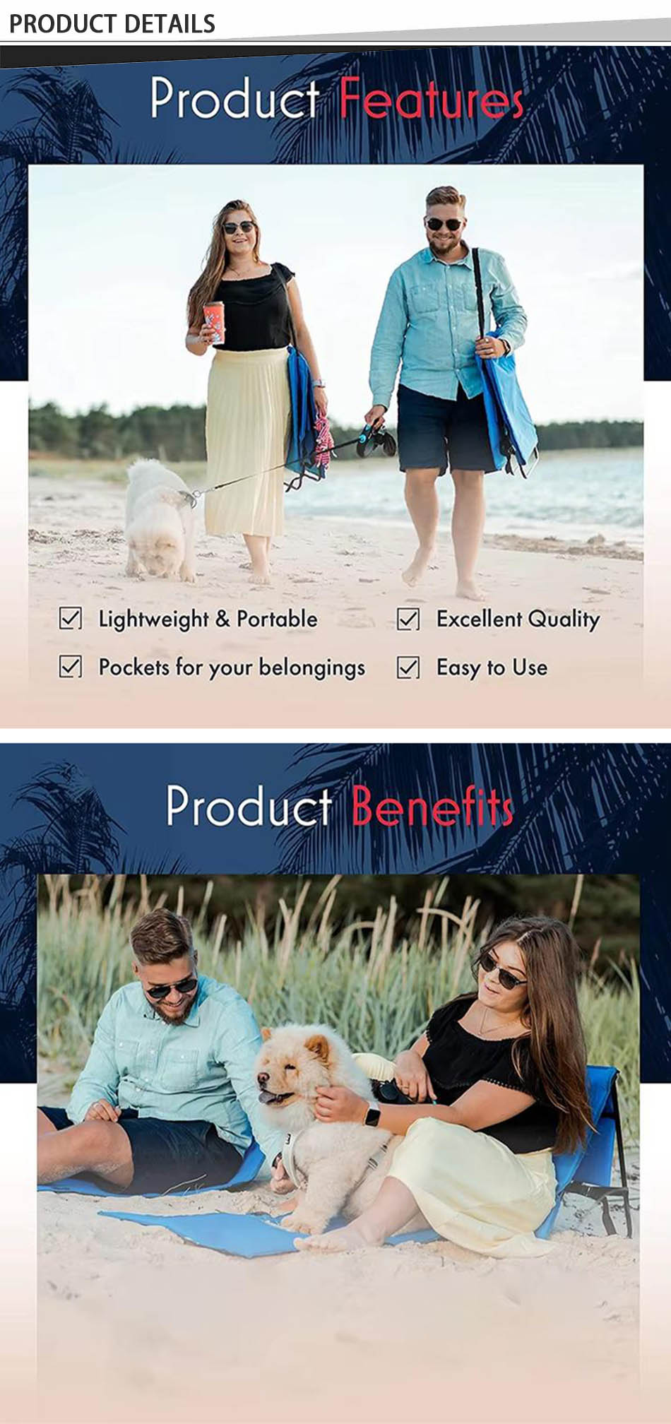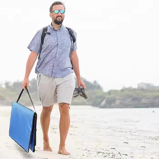 Produit : Ce tapis de plage pliant portable en vente en gros se double d'un chair de plage inclinable, offrant un confort, une durabilité et une portabilité facile pour les voyages à la plage, le camping et la détente en plein air.