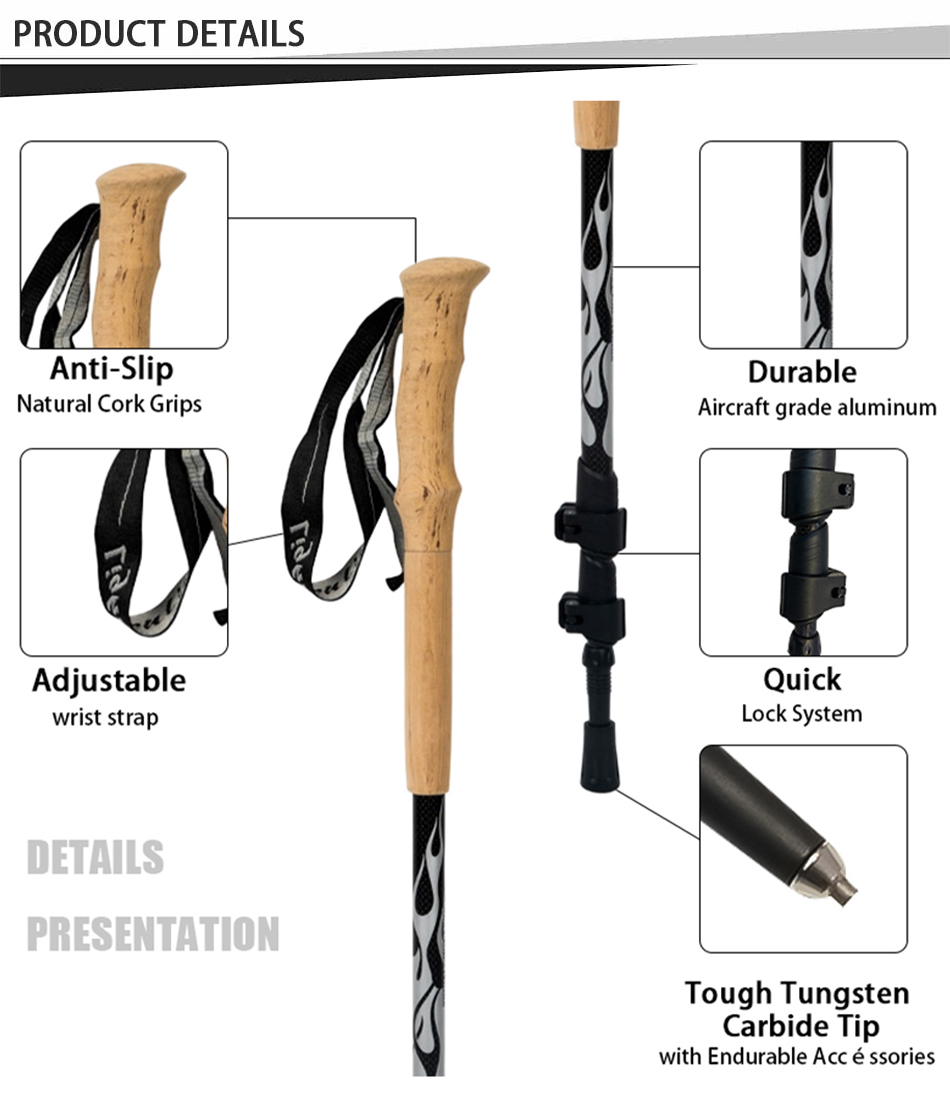 Marque : USINE ANHUI FEISTEL Fabrication liée : OEM et ODM Produit : Bâton de randonnée télescopique léger en aluminium 6013 : verrous à réglage rapide, durable, polyvalent, ergonomique, léger, idéal pour la randonnée, longueur personnalisable, solide.